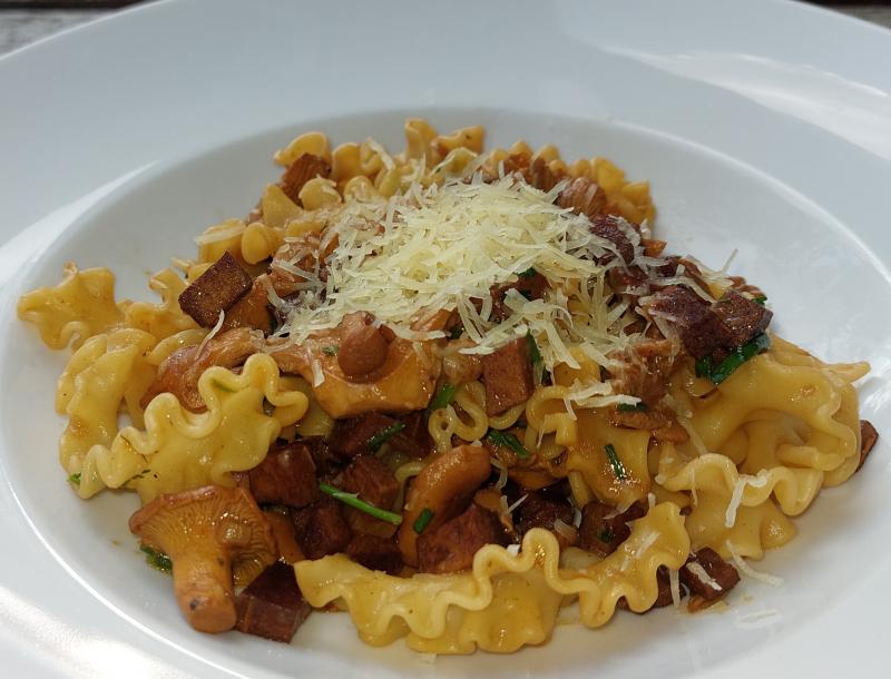 Und wieder daheim haben wir Pfifferlinge gefunden, die gab's mit Pasta und Räuchertofu