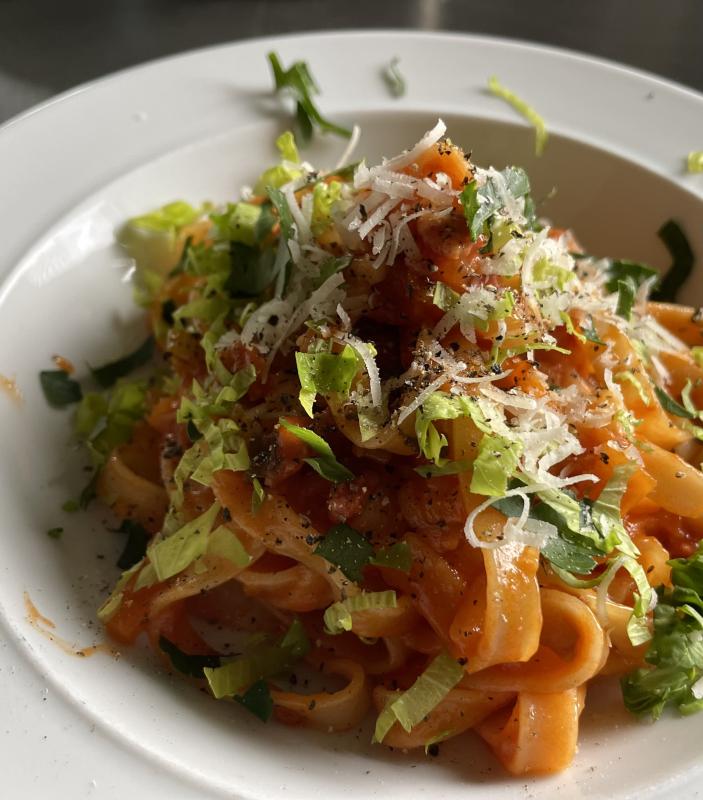 Bei uns gab es heute Ragu di Salsiccia mit Tagliatelle und viel Selleriegrün und Petersilie.
