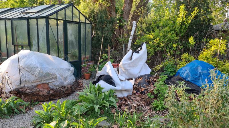 Hier mal ein Foto mit Winterschutz, links die Z. unter der Mütze. Die Z. treibt früh aus und das frische Laub muss man auch gegen Fröste schützen. Sieht nicht schön aus, aber später freut man sich! Hier ein Bild vom 22. April, als es Nachttemperaturen von -4 gab. Die Folie muss bei mildem Wetter wieder weg, der Laubhaufen wird erst Anfang Mai weggekehrt.
