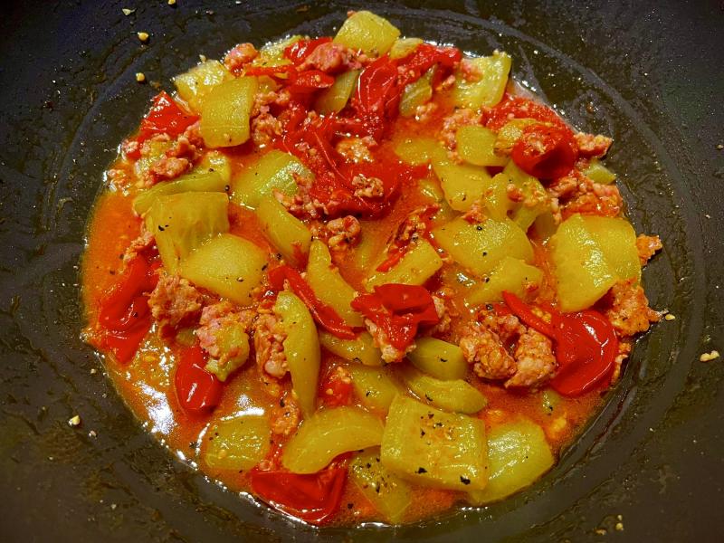 hier mussten salsicce und einige gartengurken weg – also gab es schmorgurken.