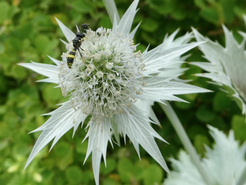 Im Vorbeiflug streifte mich gerade ein Tier und ließ sich dann unweit von mir auf den Agapanthus nieder. Durchblättern im Insektenbuch brachte keinen Erfolg. Könnt Ihr mir bitte helfen, mit wem ich es zu tun habe? Danke!