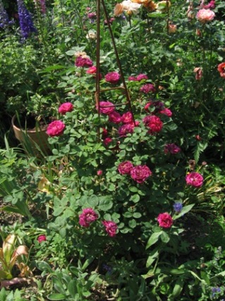 R. Gruß an Teplitz gefällt mir ausnehmend gut.Mit dem Habitus dieser Rosen innerhalb einer Gehölzhecke sehe ich keine sonderlichen Probleme. Die Zweige der etwas ausladender fallenden Rosenbüsche werden in einer Höhe von ca. 1 m zusammengebunden, so dass der Überwuchs malerisch auseinanderfallen kann.So praktiziere ich das seit etlichen Jahren mit ineinandergewachsenen William Lobb und Cuissse de Nymphe(= Maidens Blush).
