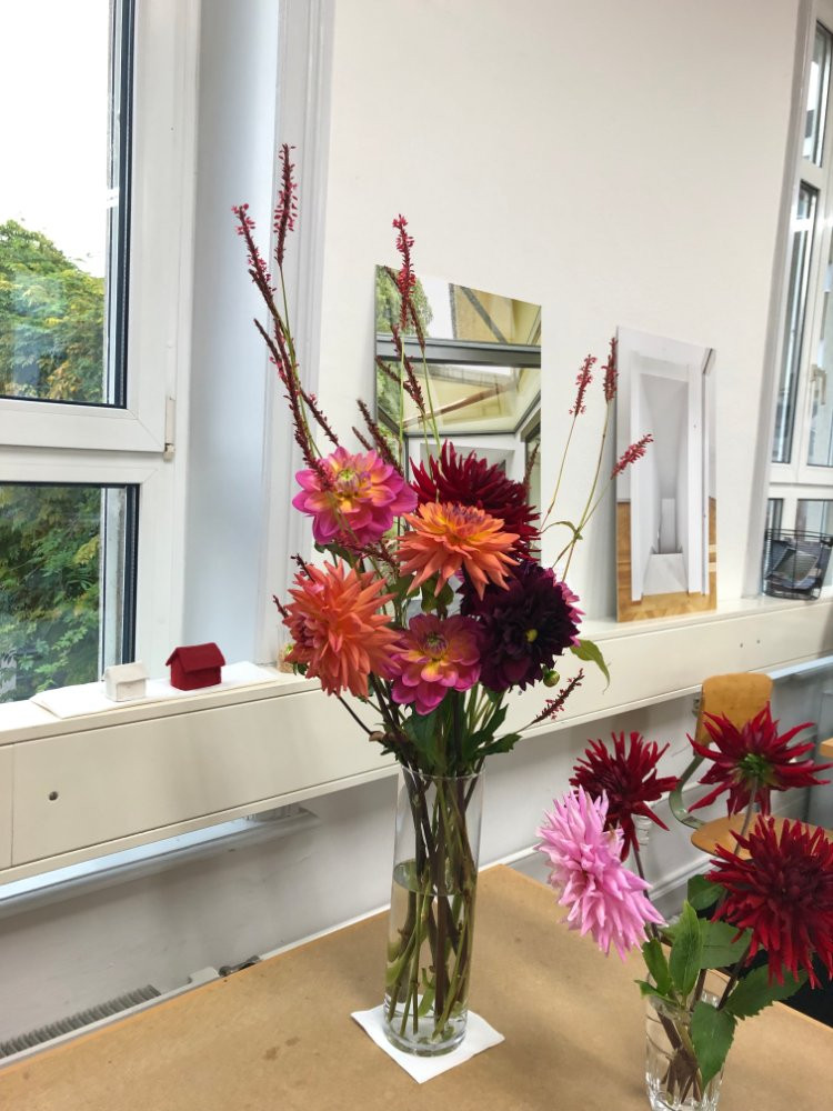 und nochmal Blümchen, wegen einer Mischung aus Zeitmangel und doch wieder freundlichem Wetter stehen meine Dahlien noch und blühen fröhlich, es hat sogar für einen 2. Strauß im Büro gereicht.