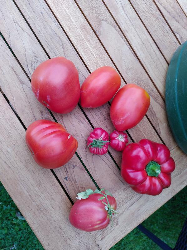 Wie immer haben wir die vorgezogenen Tomaten (nach den Eisheiligen) unter das Dach gepflanzt. Parallel sind im Gewächshaus und im Hochbeet (Trockenmauer, am Wintergarten, rundum kein Erdboden zum "Anstecken") einige vermutlich aus dem Kompost aufgelaufen. Die im GWH und draußen im Hochbeet hatten deutlichen Vorsprung aber gereift ist da auch noch nichts. Braunfäule haben wir zum Glück bisher nicht. Das sah vor einigen Jahren deutlich schlimmer aus, in einem sehr nassen Spätsommer sind uns die Tomaten unter dem Dach verfault, die waren ständig nass. Jetzt geht es trotz der Menge an Regen, der die mit Wind auch unter dem Dach nicht verschont. Ich bin sehr gespannt auf die Ochsenherzen im Hochbeet; wie gesagt, rundum kein Erdboden, in der Ecke Haus-Wintergarten sind sie recht geschützt. Schaumermal.