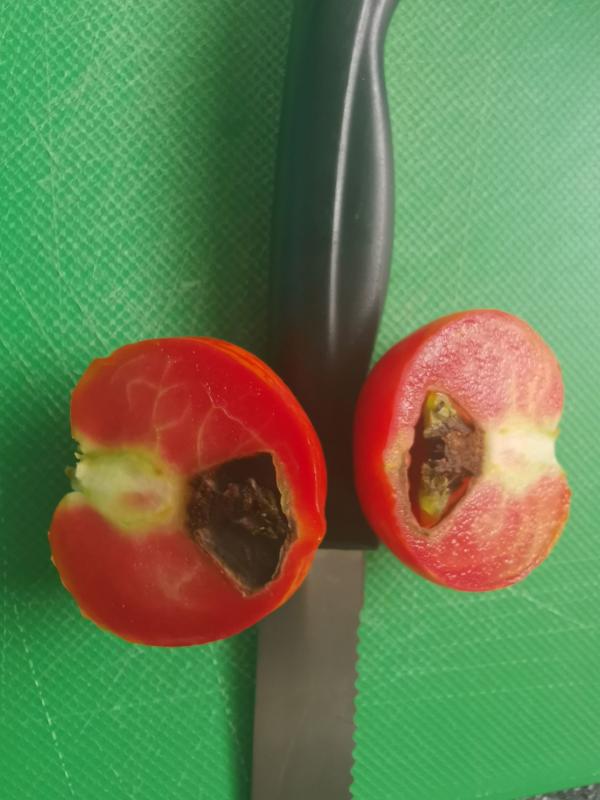 Bei einer meiner neu ausgesäten Sorten (als alte Sorte, also "tomate ancienne" in der Markthalle erstanden) hatte ich jetzt blütennah, aber abgekapselt einen schwarz-braunen Bereich gefunden, den ich bei Verbindung nach außen als BEF eingestuft hätte. Gibt es BEF auch derart abgekapselt, oder liegt hier ein anderer Schaden vor?