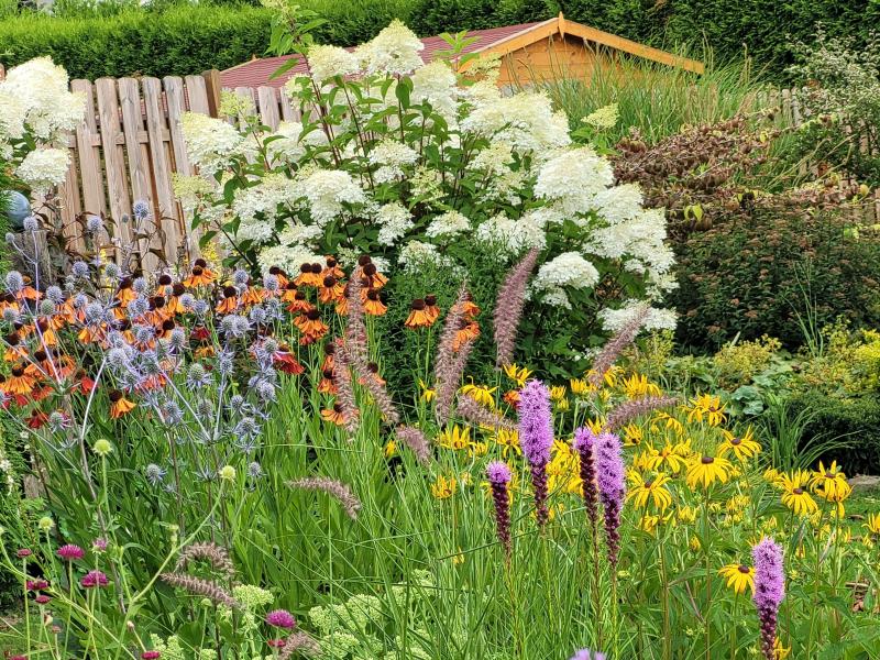 Selten habe ich im "Steppenbeet" Etwas auszusetzen, es sieht ( für mich) fast immer gut aus. So auch jetzt, wo Rudbeckia 'Goldsturm' neue Akzente setzt und Liatris in voller Blüte dagegen hält. Dazu wechselt Helenium 'Moerheim Beauty' von Dunkelrot nun auf Orange. Es kommt Farbe in das sonst eher ruhige Bild in diesem Beet. ;D