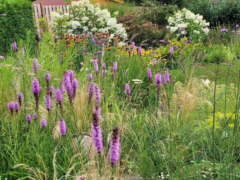 Selten habe ich im "Steppenbeet" Etwas auszusetzen, es sieht ( für mich) fast immer gut aus. So auch jetzt, wo Rudbeckia 'Goldsturm' neue Akzente setzt und Liatris in voller Blüte dagegen hält. Dazu wechselt Helenium 'Moerheim Beauty' von Dunkelrot nun auf Orange. Es kommt Farbe in das sonst eher ruhige Bild in diesem Beet. ;D
