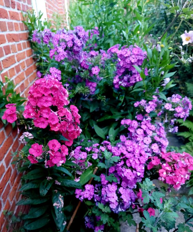 Marodierende Rehhorden und strategisch sich durchfressende Schneckenkolonnen haben vielen Stauden so auch vielen Phloxen den Garaus gemacht - ans Haus haben zumindest die Rehe sich aber nicht ganz herangetraut. Der rote Phlox im Vordergrund und an der Hauswand ist ' Starfire '