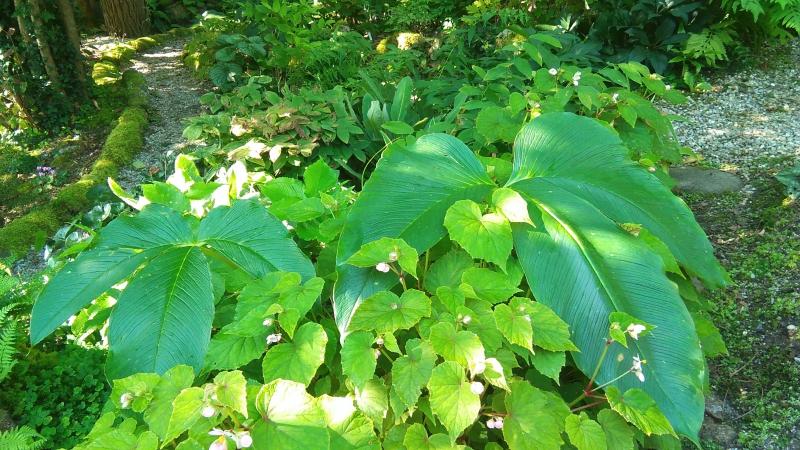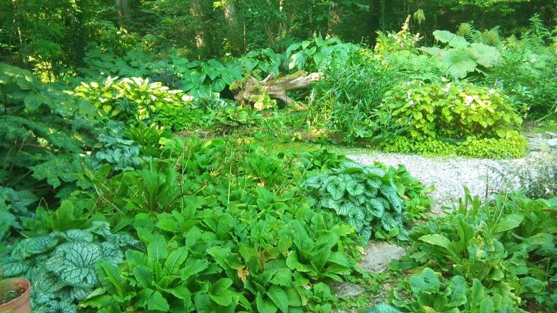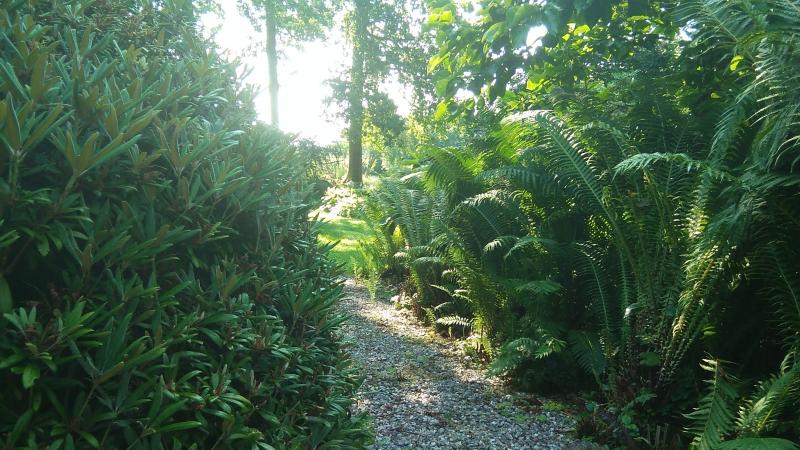Weg, links Rhodo's,, rechts Straußenfarn, fast gleich hoch.