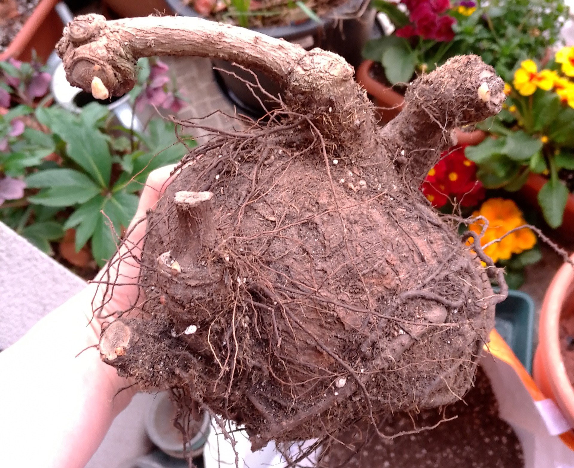 Der jährliche Umtopftag für meine Hybriden - F1 hat mittlerweile gut 1500g und einen Umfang von 51cm, also gleich wie letztes Jahr. Zugelegt haben die Seitentriebe, die sind dicker geworden