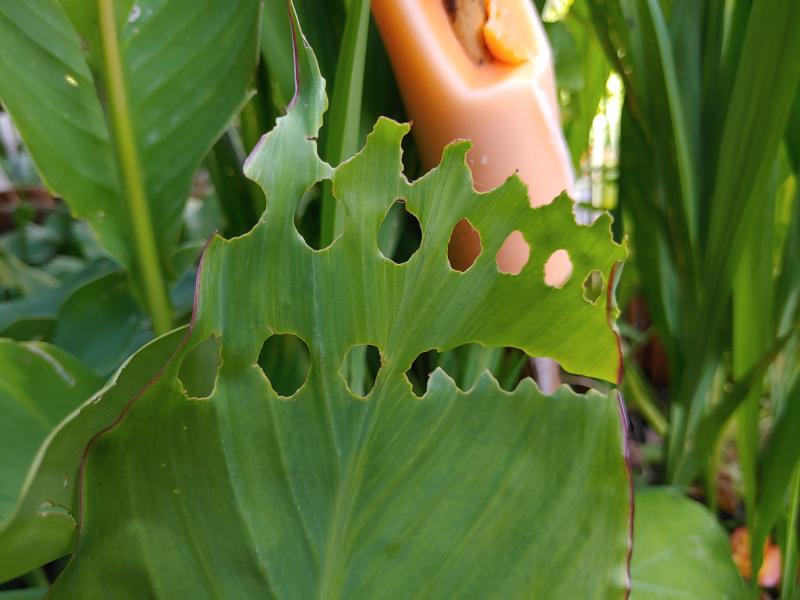 Oder es sind Schnecken, die ein noch nicht ausgerolltes Blatt durchfressen und nach dem Ausrollen sieht es eben so aus. Dagegen spricht, dass ich zuerst eine Reihe Löcher entdeckte und später eine zweite Reihe, aber da war das Blatt schon ausgerollt.