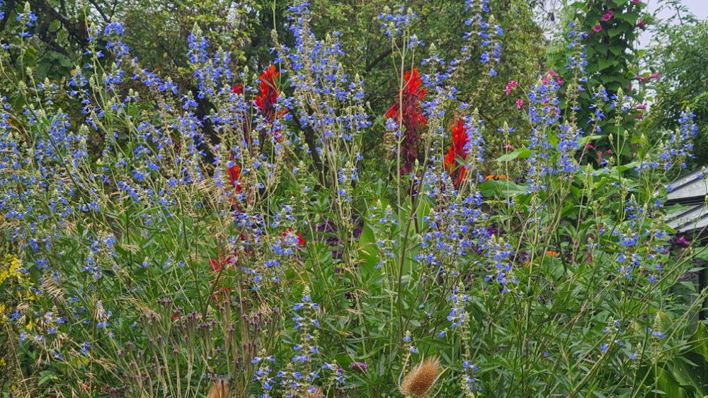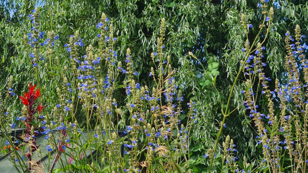 Salvia uliginosa blieb dieses Jahr im Kübel und wurde nicht ausgepflanzt. Bei reichlichen Gießen ist sie dieses Jahr sehr üppig geworden, über 2 m hoch.