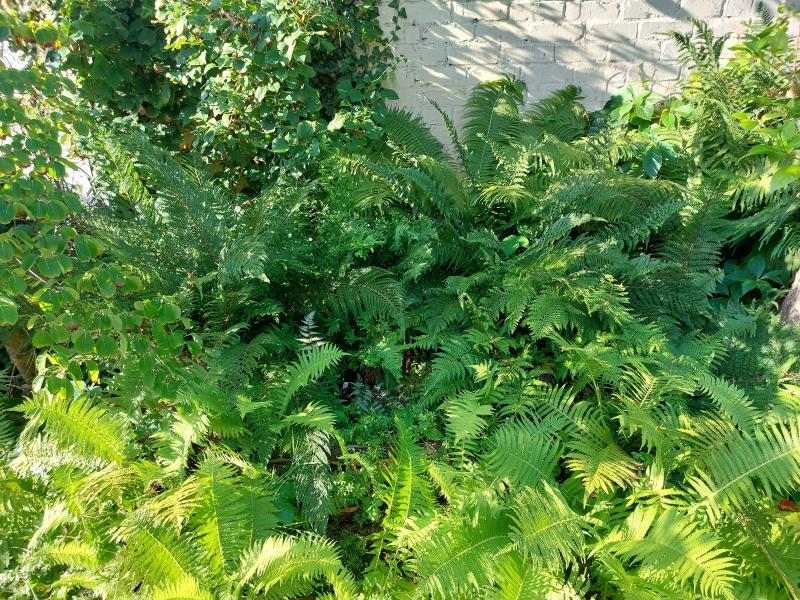 Ich habe heute früh das Farnbeet mal fotografiert und auch paar einzelne Wedel, es ist wirklich verdammt dicht. Die Wuchsform ist nicht erkennbar. Vergesst die Wucherfarne vorn, die reiße ich immer raus, man wird sie nicht los.