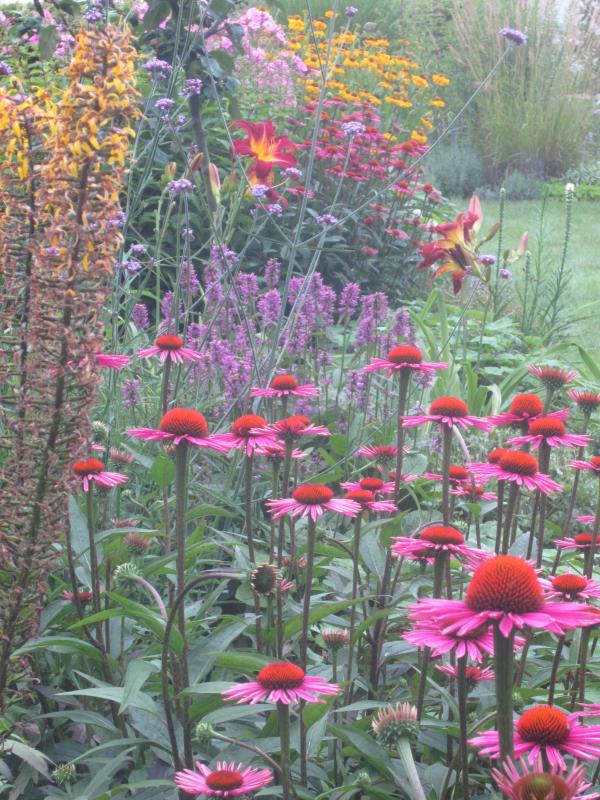 Bei meiner Mutter im Garten vermehren sich die einfachen rosafarbenen und die weißen Echinacea auch problemlos. Sie hat etwas sandigeren Lehmboden als ich, und der Schlüssel ist wohl, dass sie sich nach der Blüte gut versamen können, denn die Einzelpflanzen sind offenbar nicht sehr langlebig. Da wundert es auch nicht, dass den "Blumensträußen im Topf" keine lange Existenz im Garten beschieden ist, denn die werden sich - wenn überhaupt - eher nicht sortenecht aussamen. Hier im Garten haben sie es leider schwerer, da die Vegetation immer so explodiert und es kaum offenen Boden gibt. Ganz verschwinden tun sie aber nie.