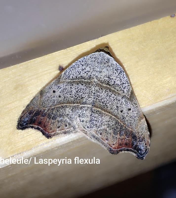 Zuerst eine Sicheleule / Laspeyria flexula. Ihre Raupe ernährt sich von Flechten und ist an ihre Fressunterlage hervorragend angepasst, wie die Bilder im Lepiforum eindrücklich zeigen.