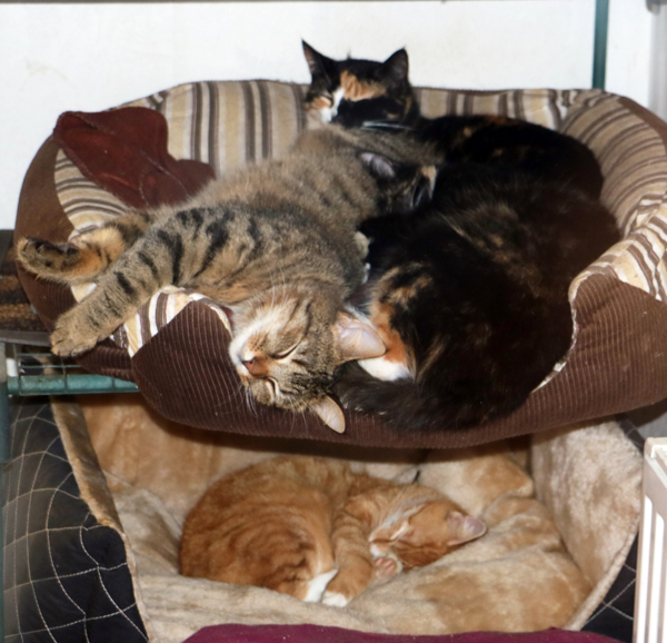 Mein "Fast-immer-draußen"-Kater Speedy kam eben durch die Klappe geplatzt, triefnass. Ich durfte ihn abtrocknen, nach dem Frühstück verschwand er im Schlafzimmer. Inzwischen haben Toffee und er zumindest einigermaßen Burgfrieden geschlossen. Dabei haben sie von Geburt an jahrelang zusammen mit ihren anderen Geschwistern in einem Bettchen geschlafen.