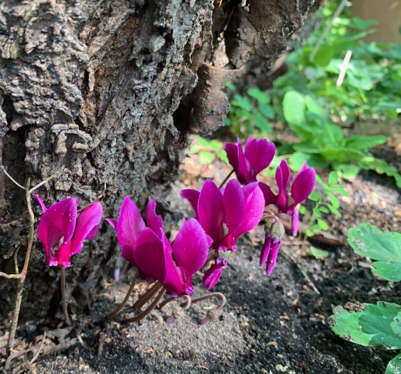 Während ich im „Salon“, im Hauptgarten, versuche, sowohl passende als auch gut sichtbare Pflanzplätze für Cyclamen purpurascens zu finden, entwickelt sich im „Vorzimmer“, im Vorgarten, klammheimlich eine purpurascens-Wiese - ich hab heute 9 blühende Sämlinge der Pflanze gefunden, die ich schon um 1995 herum gepflanzt hatte….