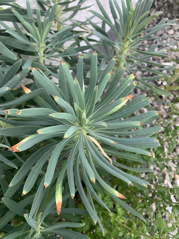 Ist die Euphorbie schon älter oder eine dieses Jahr frisch gesetzte Pflanze, welche einfach nicht eingewachsen ist und vielleicht einfach einmal einen Schluck Wasser zu wenig abbekommen hat? So wirkt sie zumindest auf mich.