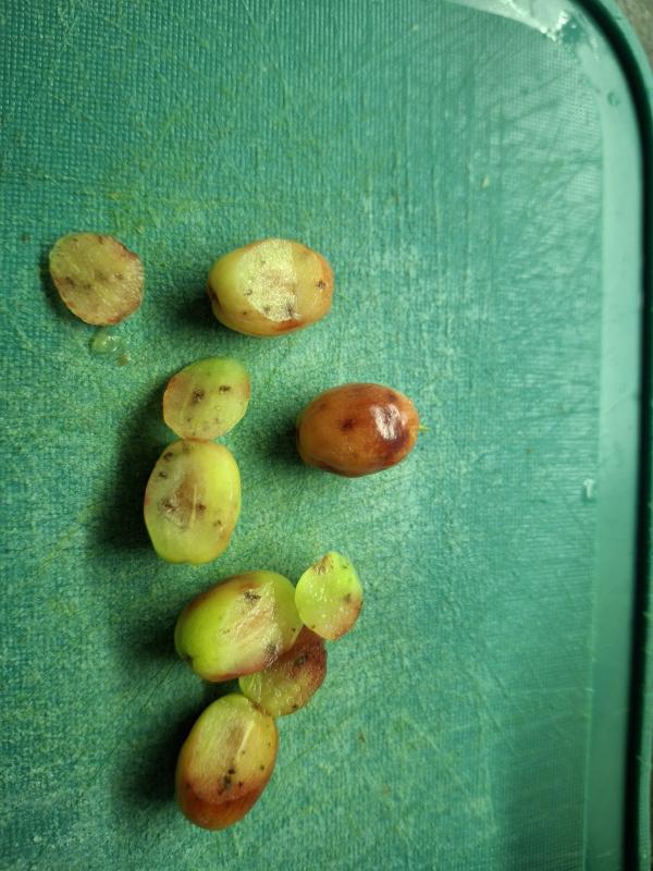 Was sind diese schwarzen Flecken - ein Pilz, Kirschessigfliege (habe allerdings keine Würmer gefunden), Hagelschaden?? Es scheint innerlich zu sein, die Hautfläche ist unverletzt, zumindest sehe ich nichts. Allerdings ist die Frucht nicht schön glatt, sondern hat kleine Dellen. Unter diesen Dellen findet man dann immer schwarze Stellen, wenn man die Frucht anschneidet.