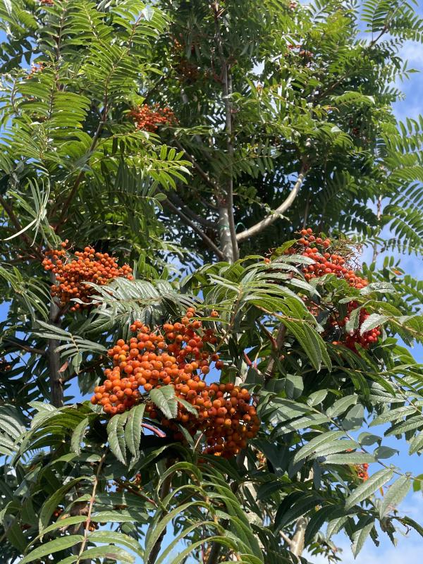 Die Beeren von Sorbus scalaris. Wahrscheinlich ein Hybrid da Sorbus scalaris eine andere, genetisch unterschiedliche Klon benötigt fur keimfähige purer S. scalaris Samen. Jedenfalls eine gesunde Baum, besser als 'unsere' Sorbus aucuparia.