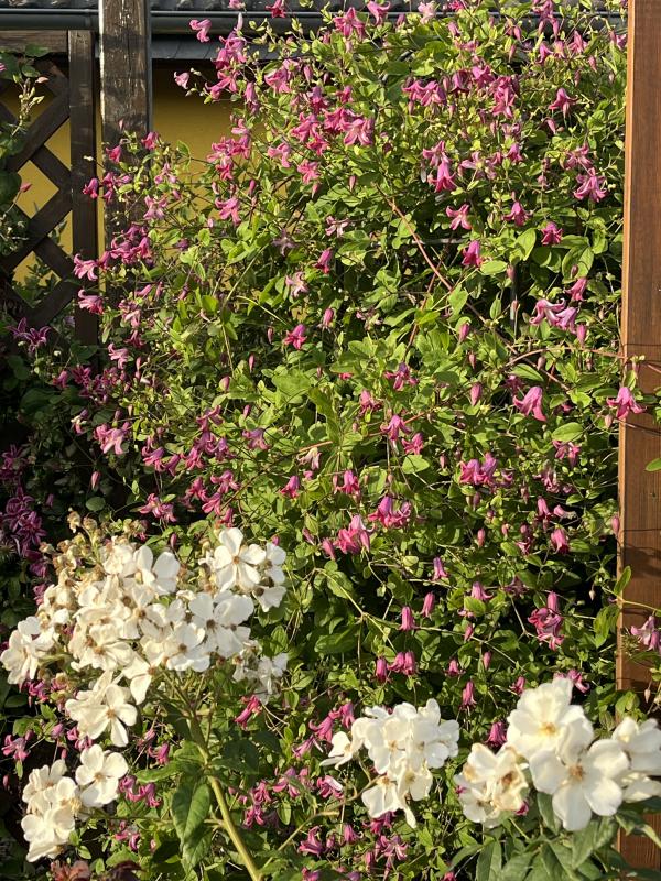 Hier blüht viticella Venosa Violacea. Ich musste sie letzte Herbst umsetzen. Ich hoffe sehr, dass sie nächstes Jahr üppiger wird