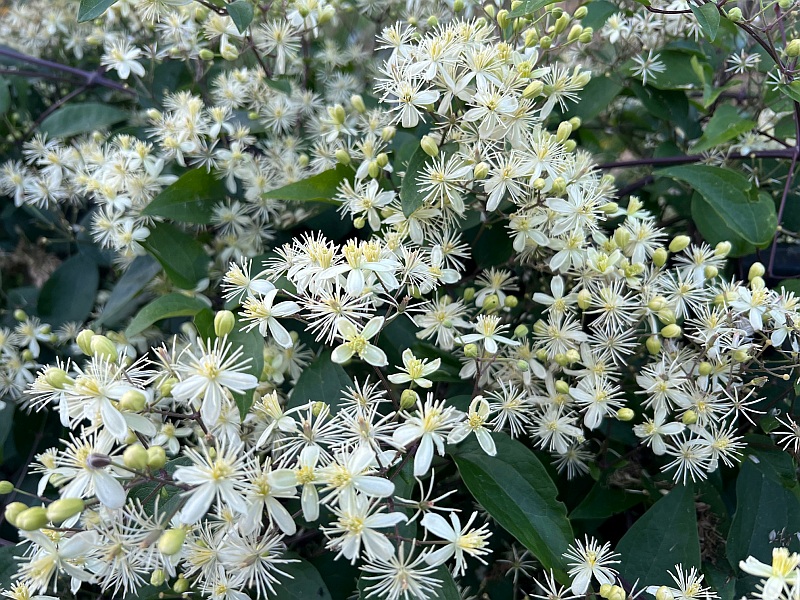 Nicht neu und ebenfalls für die Weltherrschaft gut :D Cl. jouiniana 'Praecox', die hier an einer Böschung eher als Bodendecker dient. Sie wächst allerdings auch am oberen Ende der Böschung in dort stehende große Strauchrosen bzw. in eine Hängezierkirsche. Sie braucht kein extra Wasser, das unterscheidet sie auch in Dürrezeiten deutlich von anderen Clematis! Und Dünger auch nicht .
