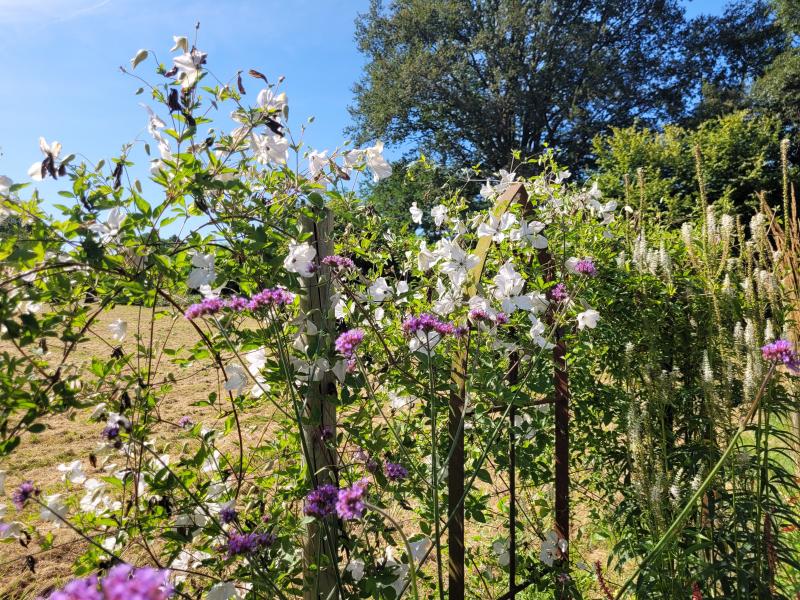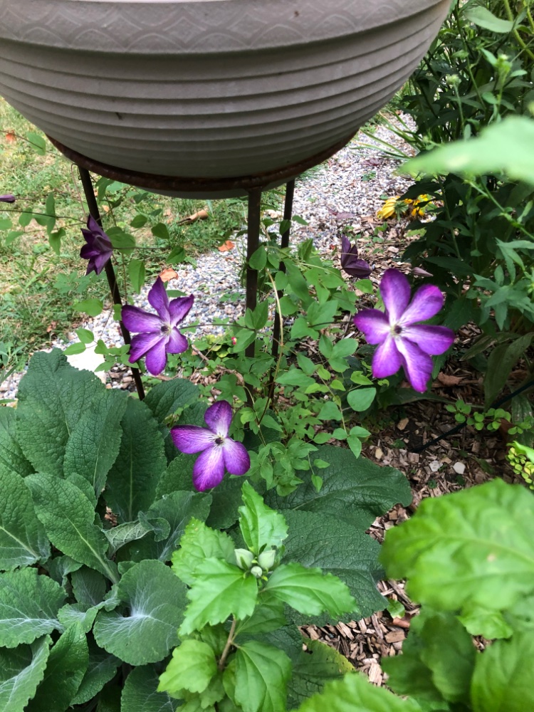 Hier blüht viticella Venosa Violacea. Ich musste sie letzte Herbst umsetzen. Ich hoffe sehr, dass sie nächstes Jahr üppiger wird