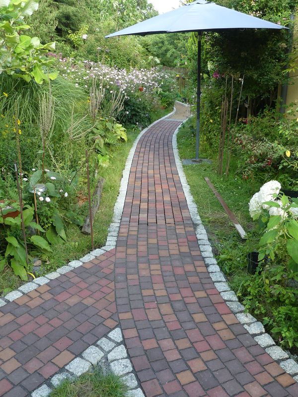 Wie auch immer, eine schöne , gerahmte Pflasterung, die , wenn die angrenzenden Stauden sie von der Seite her einzunehmen versuchen, noch schöner werden wird. Überhaupt ist dein Wegenetz mit den breiten Rasenwegen im alten Garten ein perfekter Rahmen für Gehölze und Stauden .