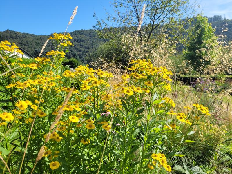 Die Herbstastern legen erst ganz Verhalten los mit der Blüte, die Gräser sind prächtig und die bereits einsetzende Gehölzfärbung schafft eine frühherbstliche Stimmung.
