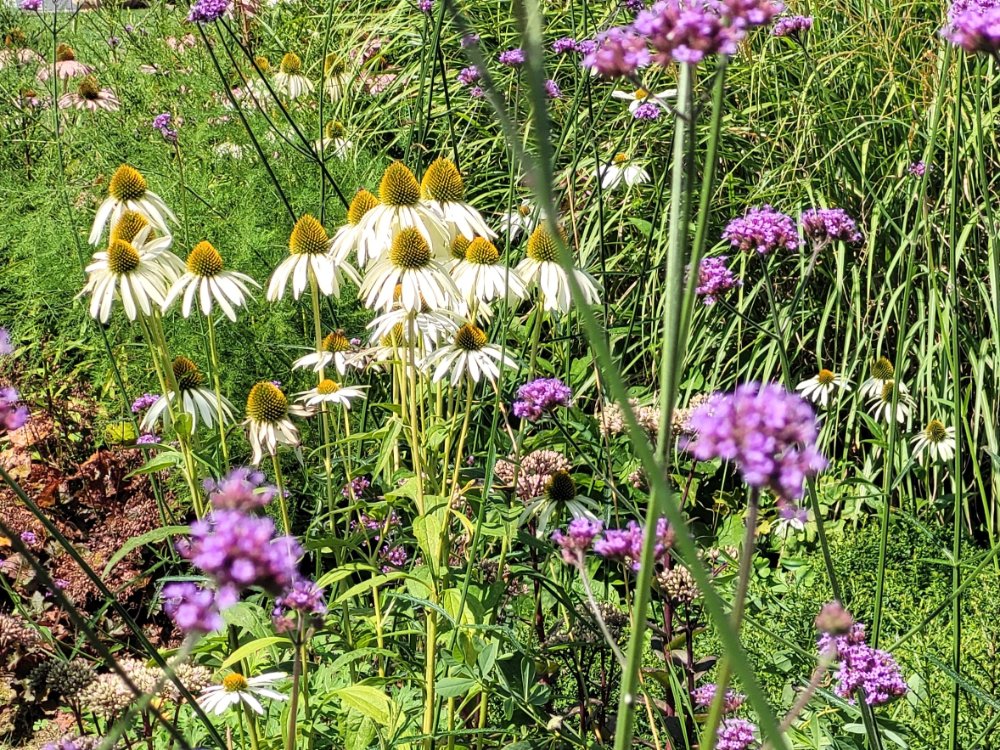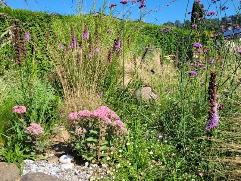 Die Herbstastern legen erst ganz Verhalten los mit der Blüte, die Gräser sind prächtig und die bereits einsetzende Gehölzfärbung schafft eine frühherbstliche Stimmung.