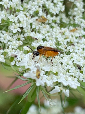 Gemeine Rollwerk und Rübenblattwepse auf wilder Möhre