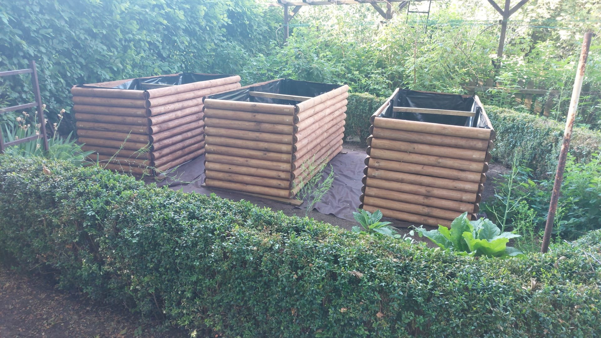 Hier mal ein Foto vom letzten Jahr, als die Hochbeete fast fertig waren. Da wusste der Spargel, der hier gerade fertig gestochen ist und erste Triebe Grün behalten darf, noch nicht, dass er weniger Licht bekommen wird. Die Ernte war ja vorher....