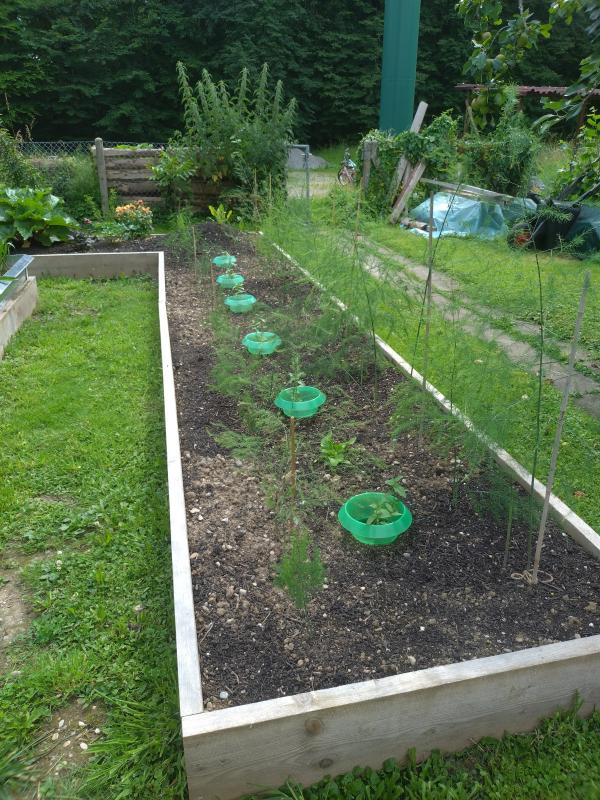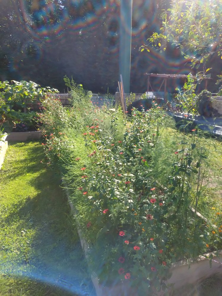 So, sieht schon so halbwegs aus wie ein Spargelbeet, dazwischen Zinnien und ein Salat der nicht mehr ins Salatbeet passte...