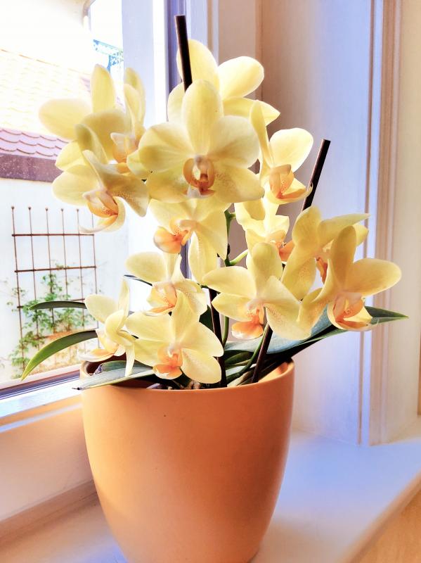 Ich freue mich gerade so - die erste Zimmerorchidee, die nicht nur überlebt hat, sondern sogar üppiger blüht als letztes Jahr. Ich bekam sie in einer "schön" arrangierten Schale in kreischgelb mit einer gefüllten pinkfarbenen Kalanchoe und quietschrosa Dekosteinchen :-X. Da ich gelb mag, kam sie in einen vorhandenen Übertopf, mit dem sie farblich gut harmoniert - geht doch ;D, Ich vermute mal, es ist Phalaenopsis Voltera.