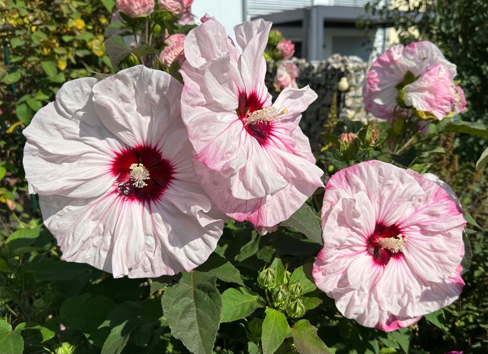 Ui, gewöhnungsbedürftig. Versuch. Es blüht endlich eine weisse Hibiskus und Physostegia. Super, dass man mehrere Bilder anhängen kann