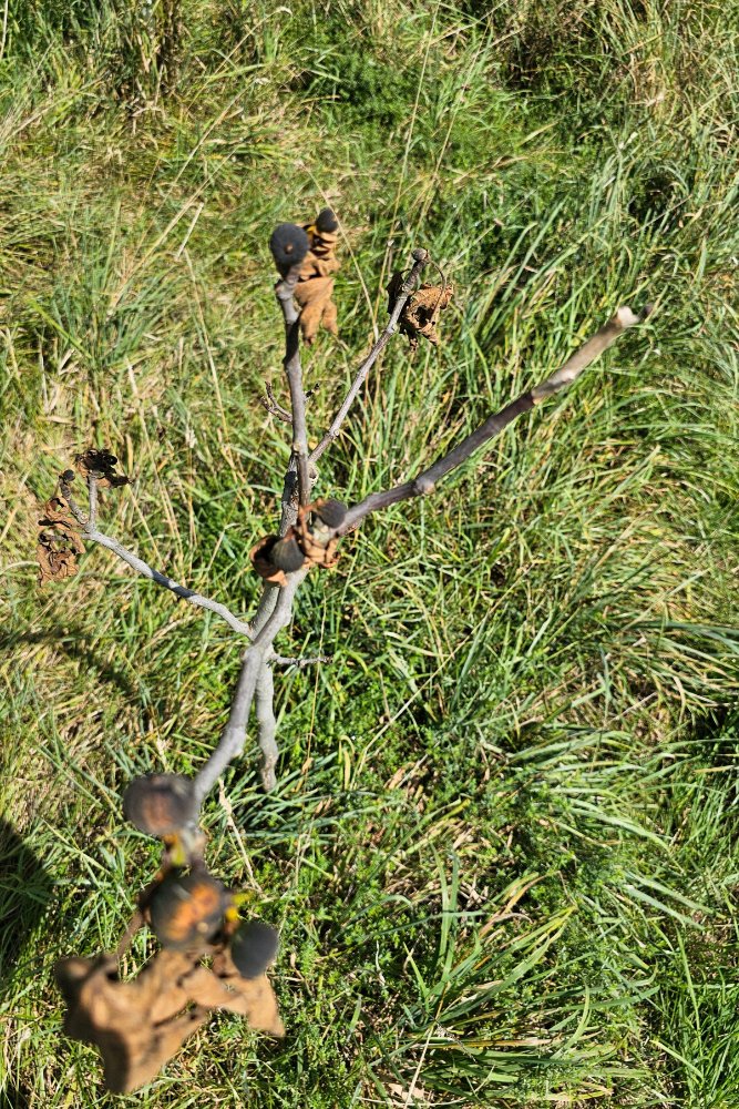 Hier sieht man das ca. 1/3 der Feigen nach dem dritten Winter tot sind. Wobei der Mäusefrass an der Stammbasis hier die meisten Schäden brachte.
