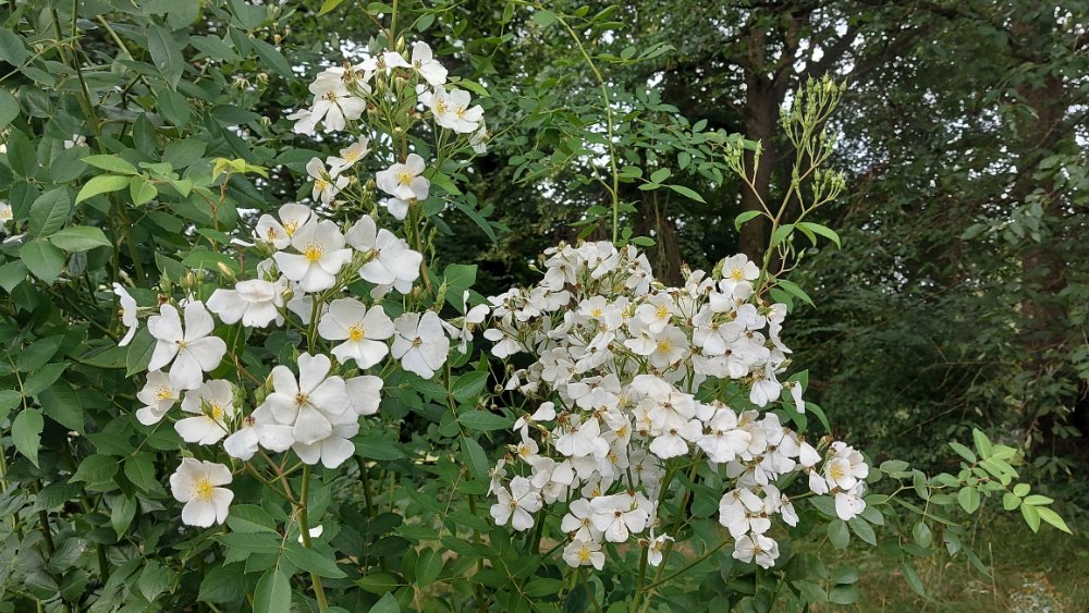 Musquée sans Soucis legt jetzt im 8. Jahr endlich richtig los. Sie hat lange gebraucht, sich in der Wiese gegen Gras und Eichenwurzeln zu behaupten, aber jetzt macht sie schon über 2m lange Neutriebe im Dutzend und die Blütenstände sind riesig geworden. Und das Beste, man riecht sie schon von Weitem. :D
