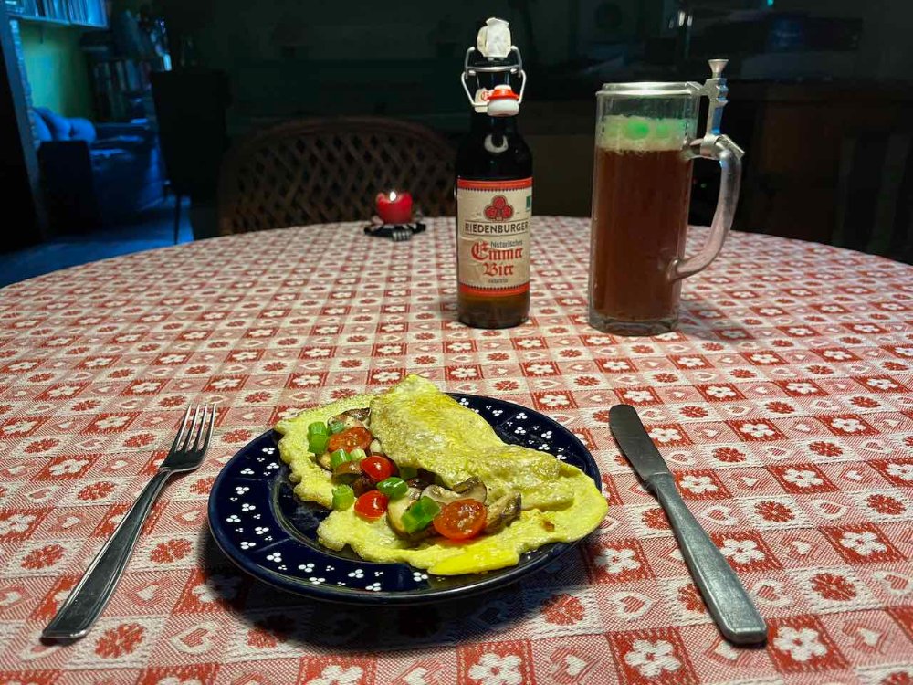 Gemüse-Omelette mit braunen Champignons, spanisch gebraten, und Rispen-Tomaten sowie Frühlingszwiebeln zum Riedenburger Emmer-Bier.
