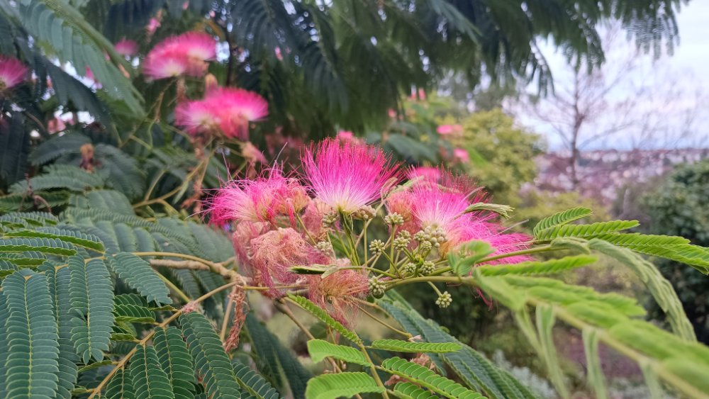Man schaut über Neustadt, einen Teil des Gartens und auf herrliche Blüten.