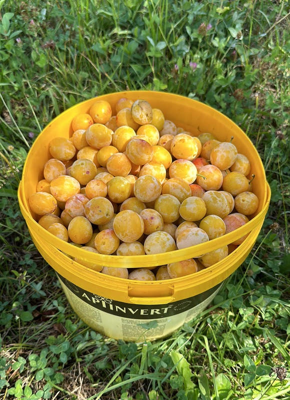 Mirabellen haben wir dieses Jahr auch üppig. Letztes Jahr fast nichts, dieses Jahr maximal. Ist leider die volle Alternanz, ist aber halt so. Die Mirabelle hat ein Vogel gepflanzt, die Wurzeln sind sehr flach. Wir hatten nur zu viel Wasser und keinen durchgetrockneten Boden, daher hat der Baum auch nichts vorzeitig abgeworfen wie letztes Jahr. Dafür sind die Trauben verpilzt, bei Trockenheit wäre es anders herum.