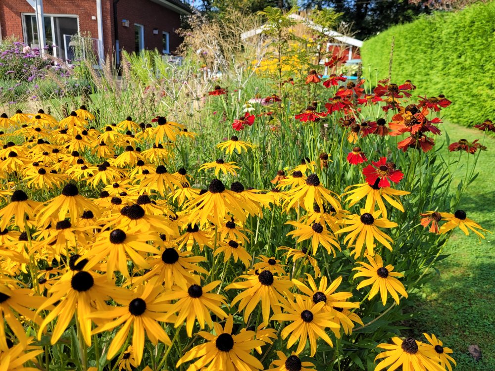 Das Voegelhaeuschen sieht kommod aus, Kompliment an die Enkelin ( und an den Werkslehrer, der den Kindern so etwas noch beibringt), Kompliment auch an die Großmutter zu den Blütenteppichen von Helenium, Rudbeckie usw.