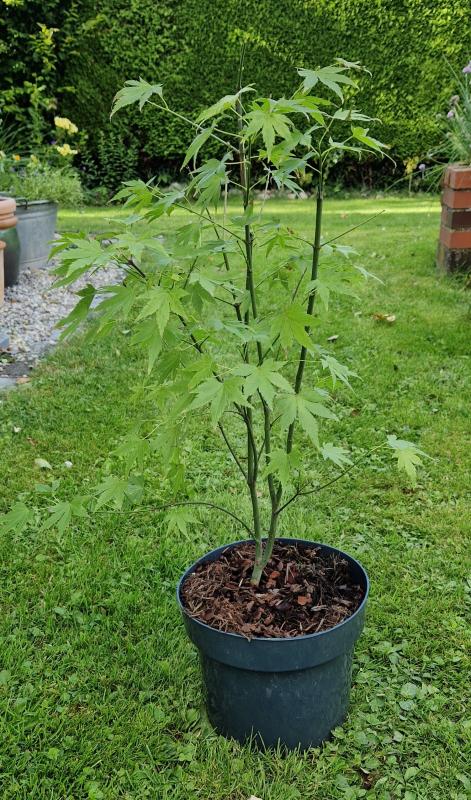 Inmitten von total vertrockneten Ahörnchen stand heute noch ein einigermaßen grüner Ahorn Orange Dream. Die Erde im Topf war auch schon ganz ausgetrocknet und für reduzierte 5,90 hab ich ihn dann doch mitgenommen. Morgen wird er getopft und gepäppelt.