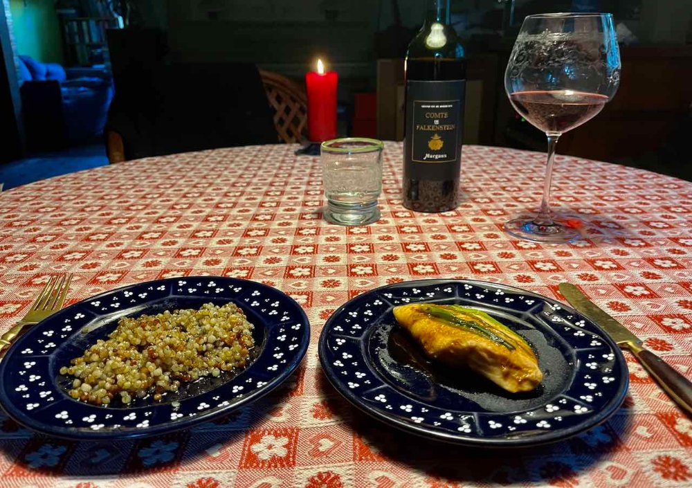 Norwegischer Bio-Lachs, asiatisch mariniert und mit Frühlingszwiebeln gedämpft sowie sardische Fregula tostata, wie Pasta zubereitet, zum Margaux 2018 aus dem Bordeaux.