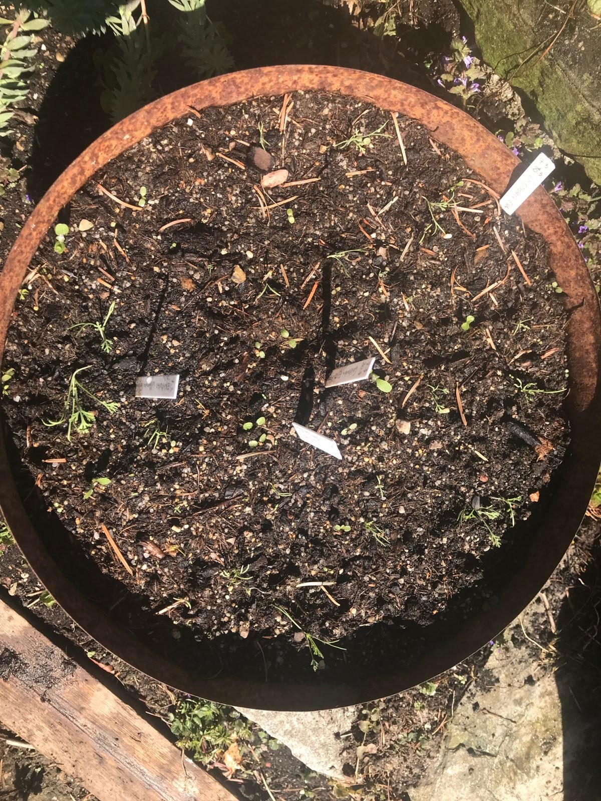 habe ich im Herbst gesät, aber es sind nur 2 frühzeitig gekommen, ein paar andere sind noch kleiner als die Vorzucht. mit Kornblume black ball im Topf.