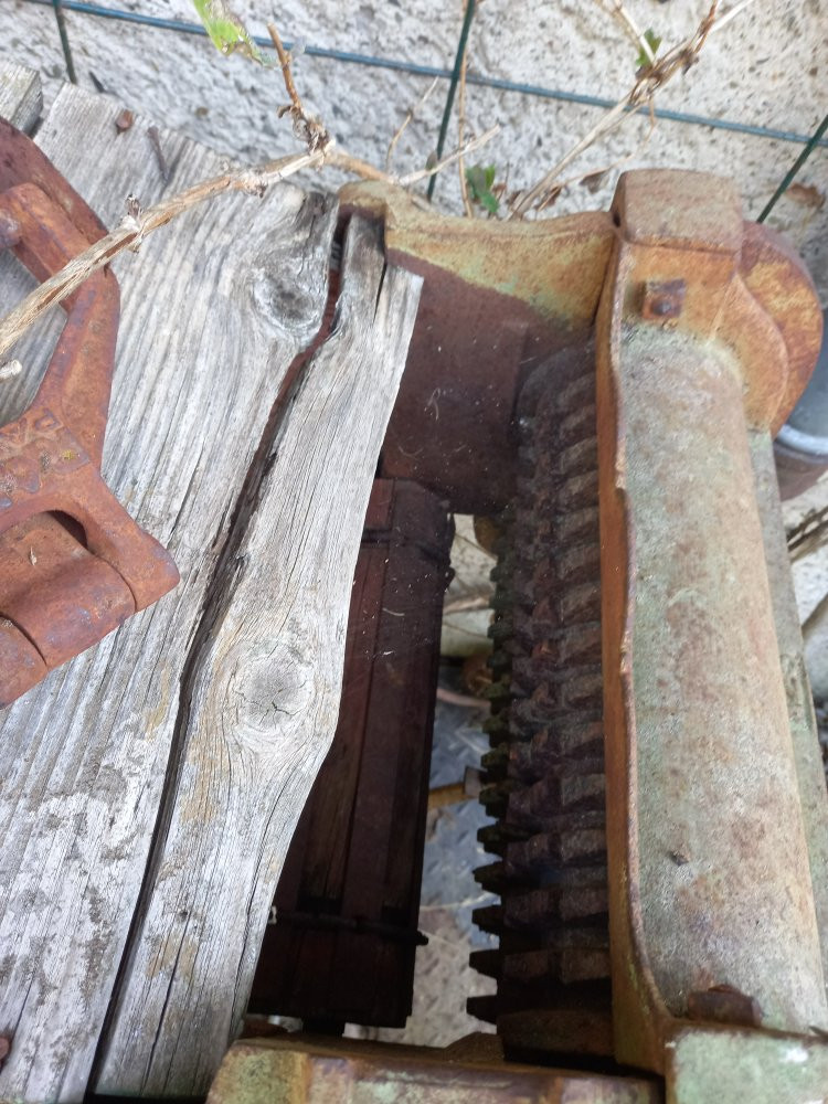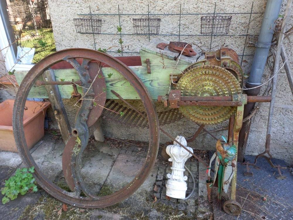 Dieser Strohhächsler habe ich bei den Tagen der offenen Gärten gesehen. Das große Metallrad wird an die Maschine angehängt und gekurbelt. Pflanzen werden über ein Band zur Schneideeinheit geführt und gehäkelt. Der Eigentümer gab an, dass er vor Jahren damit die Stauden zerkleinerte.