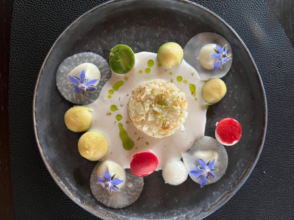 Gestern Wolfsbarsch mit Harrissacreme (Cremefraiche mit Harrissa und einem Spritzer Zitrone) und weil ich den Kugelausstecher entdeckt habe Kohlrabikugeln und nochmals Kohlrabitartar und die Reste der Kokossauce.