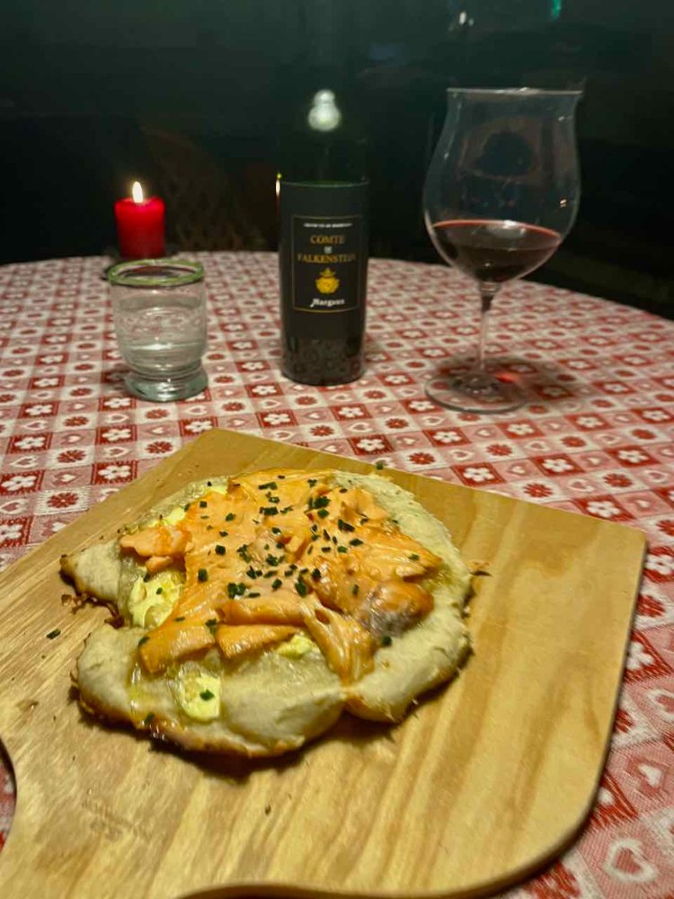 Ich wollte wieder eine Tarte flambeée machen, da ich mich mit dem Wasser aber vertat, wurde es eher eine Pizza. Also Flammkuchen mit Räucherlachs, Schalotten und Knoblauch wieder zum Margaux.