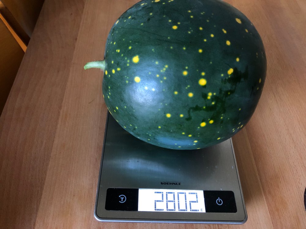 ich habe letzte Woche eine Frucht der "Moon and stars" geerntet, weil ich leider keine verlässlichen Fotos zur zeitlichen Entwicklung hatte. Was soll ich sagen, klang schon etwas hohl aber war dann definitiv noch nicht reif. Wobei einige Partien in der Mitte besser als unreife Fehlkäufe schmeckten.