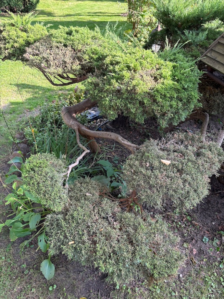 Dieser ist sehr gut angewachsen. Vor etwa 10 Jahren habe ich versucht ihn „japanisch“ zu beschneiden. Seitdem wächst er extrem unregelmäßig. Ca. 50% ist braun und mickrig, an anderen Stellen schlägt er aber richtig aus.
