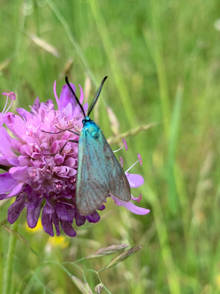 Hier ein Grünwidderchen, dickopffalter und kaisermantel auf Butterfly Blue. Schon absurd wie groß de Blüten der Sorte Butterfly Blue auf guten Böden ist, dazu vergleiche mit der Knautia unten und dem Widderchen